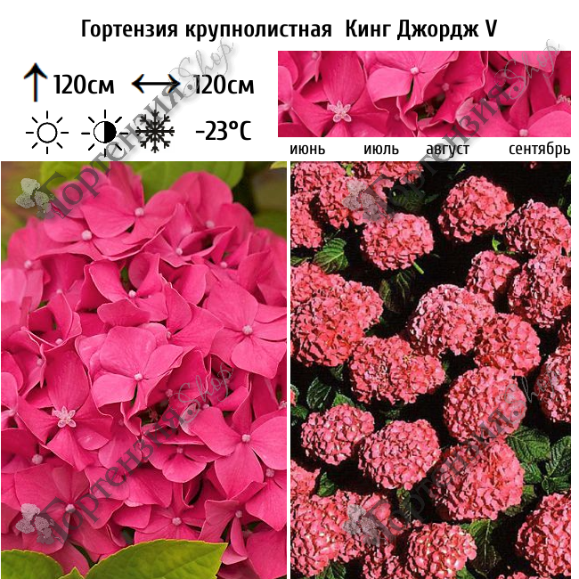 Гортензия крупнолистная Кинг Джордж V (King Dzhordzh V) - обильно цветущий кустарник высотой и шириной до 120 см. Крона компактная, округлая. Цветет куст пышно в течении всего лета. Соцветия крупные, малинового- розового цвета, могут достигать в диаметре 30 см. Требует укрытия на зиму для сохранения прошлогодних почек.