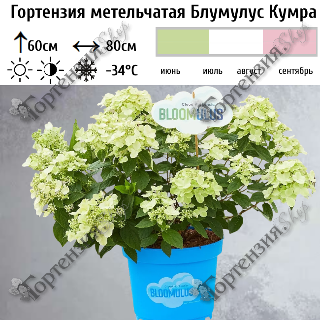 Гортензия метельчатая Блумулус Кумра (Hydrangea paniculata 'Bloomulus Cumra') — это компактный сорт из новой серии "облачных" гортензий Bloomulus. Цветки кремовые с выраженным зеленым оттенком, далее меняет на белый с легким лимонным отливом, осенью могут приобретают нежный розовый оттенок. Классическая кружевная форма соцветия, напоминающую кучевые облака, уникальна среди метельчатых гортензий. Зацветает рано, уже в июне вы увидите нежные цветки гортензии. Самый необычный сорт, который легко спутать с крупнолистной гортензией из-за его плоско-округлых щитковидных соцветий. Сорт морозостойкий.