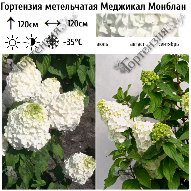 Гортензия метельчатая 'Меджикал Монблан' - сорт назван в честь одной из самых известных горных вершин нашей планеты - горы 'Mont Blanc' (белая гора).