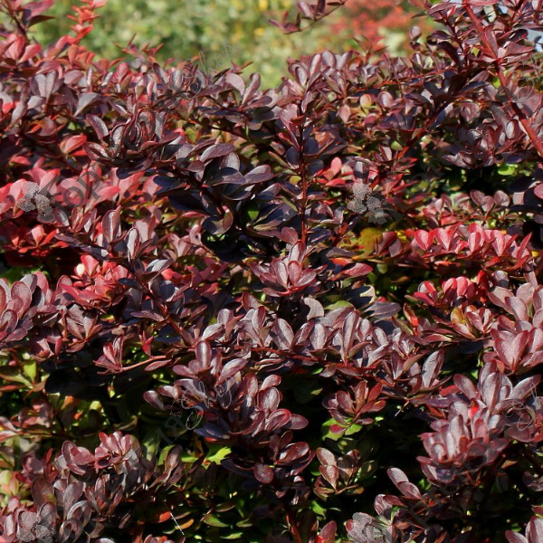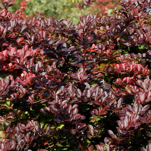 Барбарис Тунберга Кармен - красивый, невысокий, раскидистый кустарник. Крону образуют дугообразные побеги красно-пурпурного цвета. Высота куста 80-100 см., растет медленно, достигая максимального размера через 8-10 лет. Листья небольшие, до 3-4 см., красно-коричневого или кроваво-красного оттенка, осенью - ярко-красные.Цветки мелкие, желтые, собраны в кистевые соцветия по 3-5 штук, плоды - ярко-красные ягоды, продолговатй формы, съедобные. Цветет барбарис Тунберга Кармен в мае.Не требователен к почвам, зимостоек.
