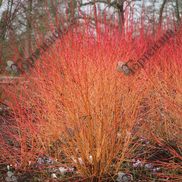 Дерен кроваво-красный (Cornus sanguinea Widwinter Fire) 'Мидвинтер Файер' - кустарник высотой и диаметром до 1,5 метра. Побеги красно-оранжевые, особенно яркие на солнечной стороне. Листья темно-зеленые, удлиненно-овальные. Осенняя гамма от винно-красного до желто-оранжевого тонов. Цветки белые в щитковидных соцветиях позже появляются темно фиолетовые ягоды. Особенно эффектен поздней осенью и ранней весной. Растет медленно.