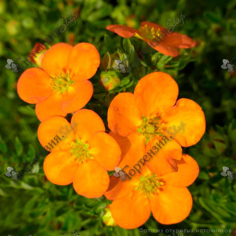 Цветки полумахровые, яркие, насыщенно-оранжевые, крупные, диаметром 5см, не выгорают по мере цветения.  Пятилисточник кустарниковый. Необычайно выносливый, сильно ветвящийся кустарник. Обильно цветёт с июня по сентябрь. Предпочитает солнце, полутень. Почва умеренно влажная, плодородная.