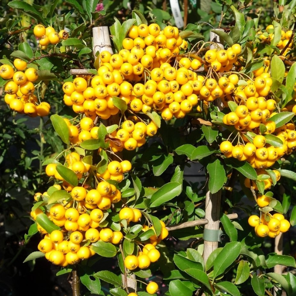 Пираканта – декоративно-растущий кустарник, который чрезвычайно ценится садоводами за обильное цветение и столь же красочное обильное плодоношение. Они красиво смотрятся в разнообразных композициях у стен зданий и солитером на газоне. Пираканты восхитительны в посадке отдельными кустами или же группами в виде живых изгородей. Солейл де Ор — быстрорастущее растение, которое за сезон может прибавить около 40 см. Плоды- это ягодки ярко-желтого цвета, которые в диаметре 6-8мм, собраны в соплодия, созревают в сентябре и держатся всю зиму, несъедобные.