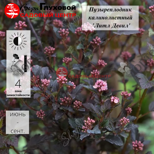 Пузыреплодник калинолистный (Physocarpus opulifolius) 'Литтл Девил' - компактный, вертикально растущий миниатюрный куст, с веерообразной кроной, высотой до 120 см. Узкие, зубчатые листья, красивой, темно-пурпурной окраски, которая сохраняется на протяжении всего сезона. Цветет продолжительно в июле-августе. Розоватые цветки собраны в некрупные шапочки щитковидные соцветий.