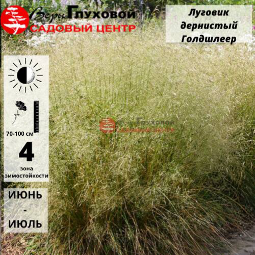 Луговик дернистый Голдшлейер - многолетний злак с темно-зелеными листьями, образующий плотную кочку. Зацветает в июле, желтовато-зелеными метелками. Хорошо растет на увлажненных плодородных почвах, морозостойкость -34С. Подходит для посадки возле водоема в миксбордерах и как солитер.