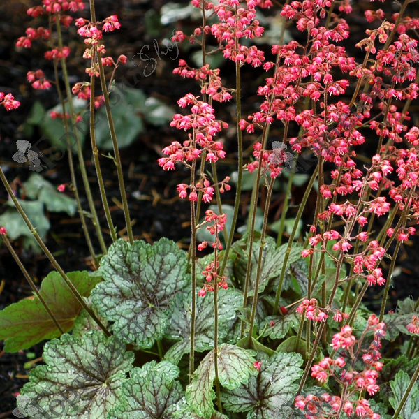 Гейхера гибридная Пеперминт Спайс (Heuchera x hybrida 'Peppermint Spice' (Coral Bell))- Травянистое, многолетнее растение. Листья крупные пальчато рассеченные, зеленые с бордовыми прожилками. Цветет в июне розовыми, едва заметными цветочками на длинных, прямых цветоносах. Является украшением альпийских горок, рокариев и клумб. Морозостойкость -34С. Почвы предпочитает рыхлые без застоя воды плодородные.